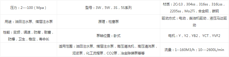 適用范圍: 油田及礦場注水泵、超高壓泵、噴射泵,除鱗泵、高壓清洗泵,加濕泵,噴霧泵,流程泵、稠漿泵、泥漿泵、液態(tài)二氧化碳泵、洗滌劑料漿泵、化工泵、液壓泵、輸油泵,海水泵等專業(yè)用泵。 特 點: 該泵吸收國內(nèi)泵業(yè)之精華,設(shè)計先進(jìn)、結(jié)構(gòu)緊湊、體積小、泵效高、運(yùn)行平穩(wěn)、安全可靠、操作簡便、產(chǎn)品制作精良、外形美觀。每個品種的泵都有安全調(diào)壓閥,泵壓可以任意調(diào)節(jié),并有油溫、壓力、自動保護(hù)。 結(jié)構(gòu)型式:固定式、移動式 泵體結(jié)構(gòu):臥式、立式 傳動型式:電機(jī)或柴油機(jī),變速型式:皮帶、齒輪、電磁調(diào)速、變頻速、 主要零部件:機(jī)座(材料HT250);泵體(材料:316、1Cr18Ni9Ti、2Cr13、 碳鋼化鍍鎳-磷合金防腐層)經(jīng)熱處理,避免疲勞破裂;曲軸(材料:35CrMo、42CrMo)經(jīng)調(diào)質(zhì)硬氮化處理、強(qiáng)度大、硬度高、耐磨耐用;柱塞(材料:超性陶瓷、噴焊鎳合金Ni60耐磨耐腐層);盤根密封(采用進(jìn)口芳綸或碳素纖維)。 閥組型式:錐閥、平板閥、組合閥等。經(jīng)特殊處理,耐磨耐用。